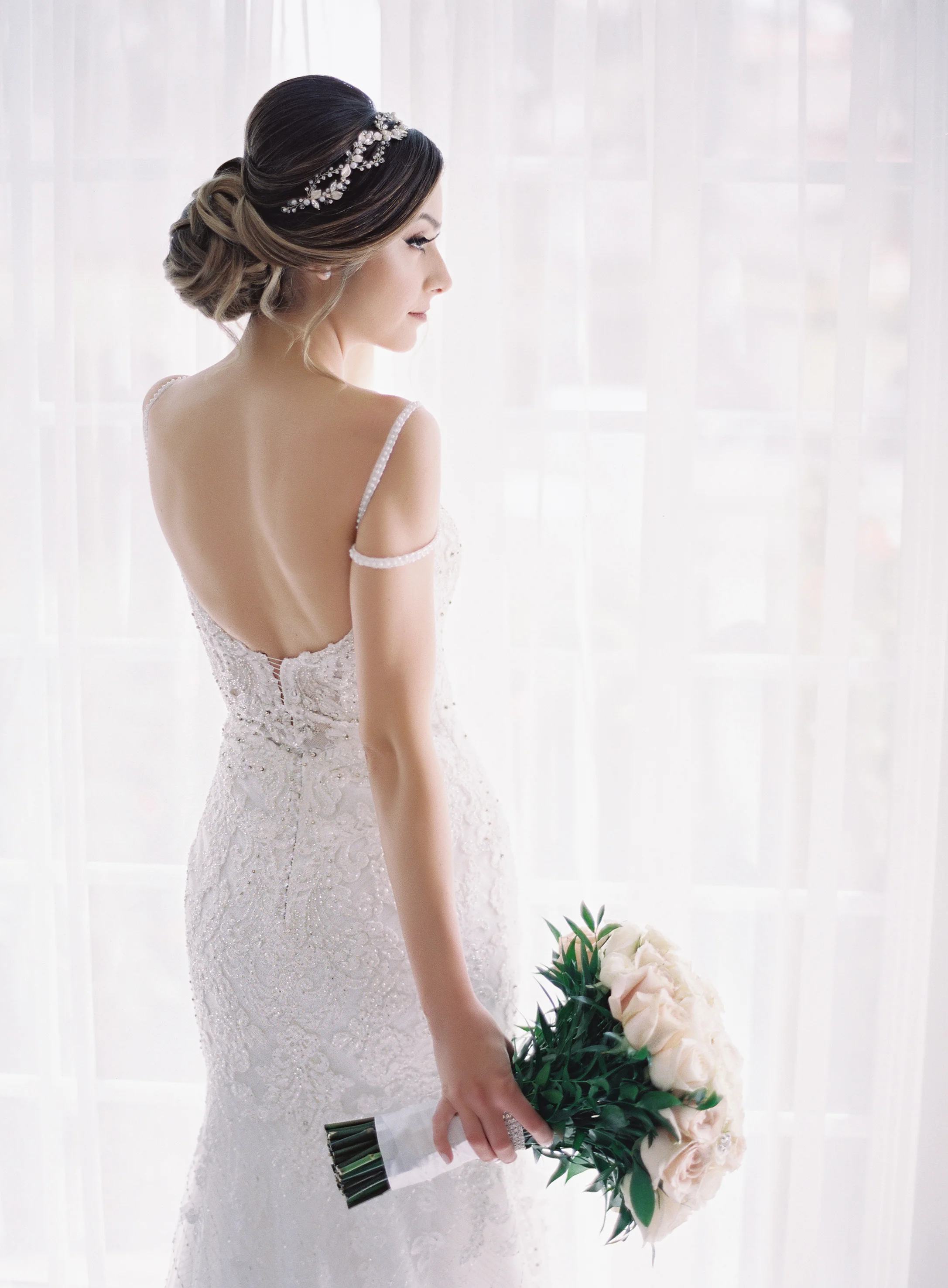 What was your favorite part of your bridal look? Of course, every detail of a bride's look plays a part in the overall beauty of the bride. But, if I had to pick my favorite part, I would definitely pick my dress. What I adored most was all the beading and lace detailing, along with the low back and how it tightly hugged my body, yet opened up perfectly to a long train. However, without my veil and headpiece, my dream bridal look would not be complete! Everything together, complimented more than I could have ever imagined.